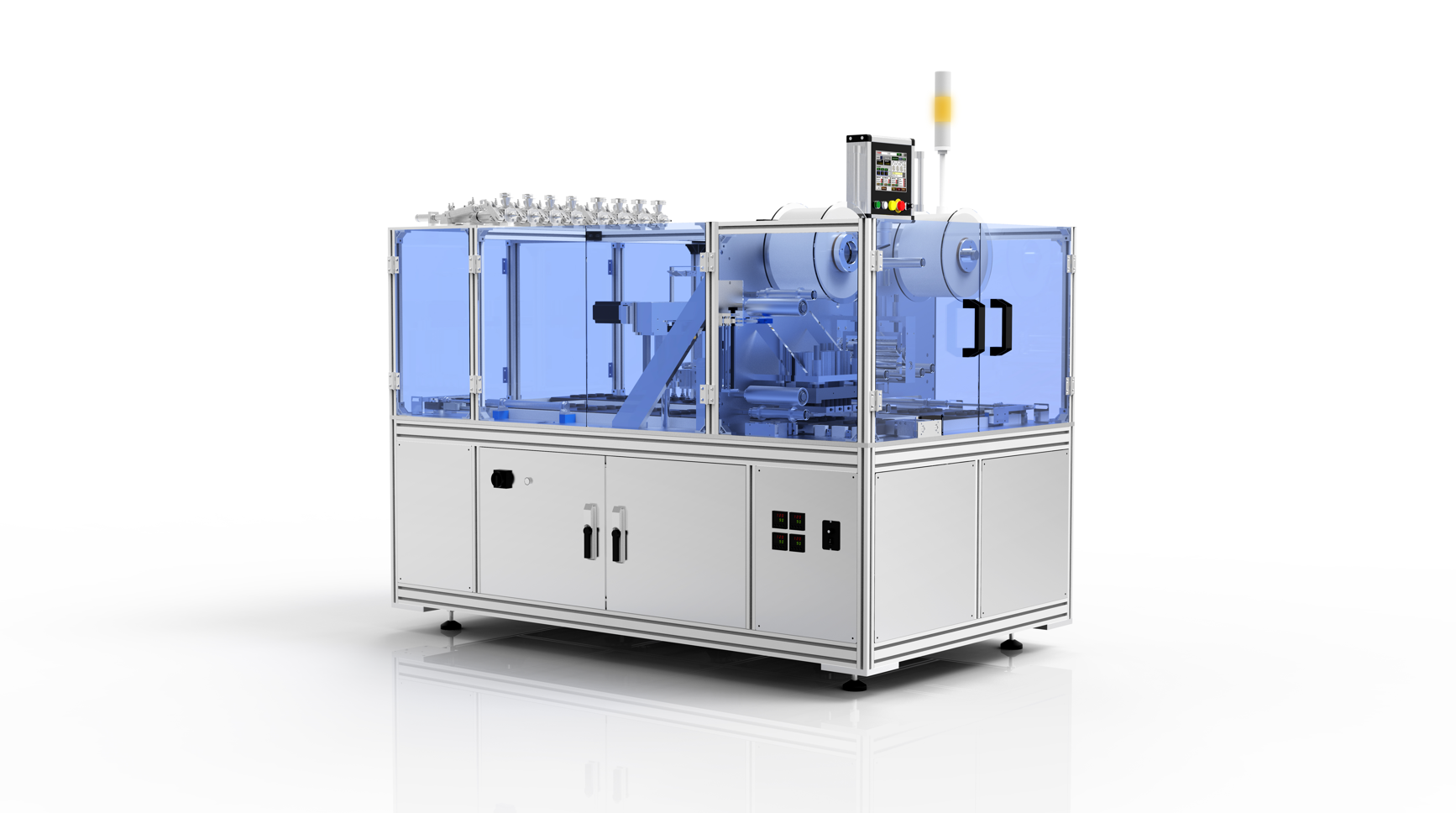 該機型用于杯裝容器包裝產品的生產,使用的容器非在線成型沖壓容器,而是預成型注塑容器。設備采用人工放置容器,容器放置到1×8或1×6的模具托中,由模具托承載容器到各個工位。設備包括灌裝工位、封頂蓋工位、取出工位等。配置6頭或8頭柱塞泵灌裝系統。頂蓋采用卷膜的形式,在封接工位在線沖裁到容器頂部。